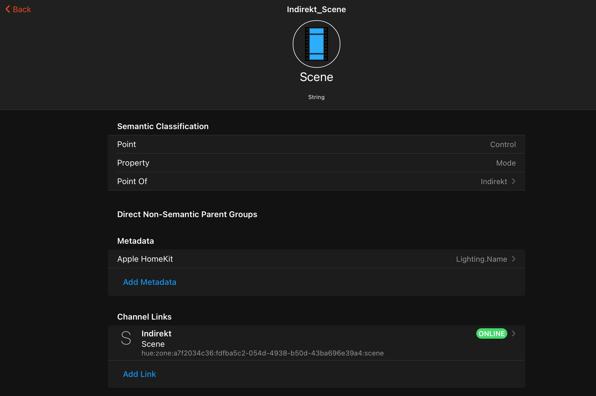 1/ You can create a scene in homekit app. Scene doesn’t send any information to the binding, scenes don’t have a state ON/OFF etc.