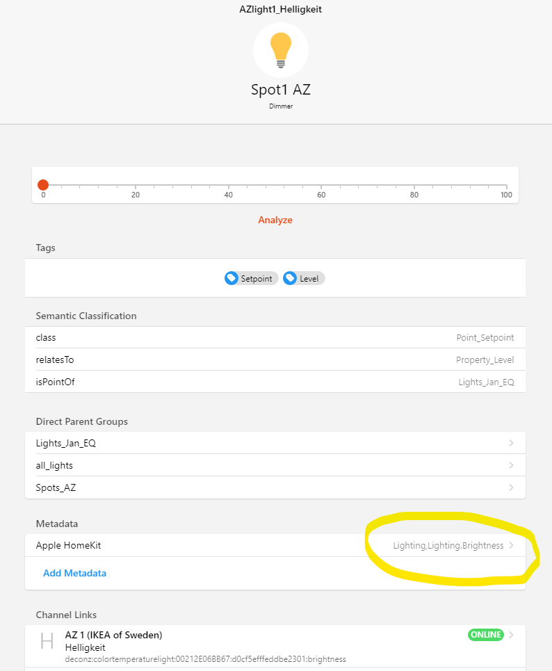 That’s what I believe GJW was trying to do, and so am I - I have an “Equipment” group for a light and I’ve added the “Lighting” homekit metadata to it. The colour control is an item/Point in that group, and it has homekit metadata “Lighting.Saturation”, “Lighting.Hue” and “Lighting.Brightness”. That results in a single thing being exposed on homekit that however only has an OnCharacteristic - the item is ignored, and only the metadata on the group is honoured/exposed. That seems counter to what the documentation describes?