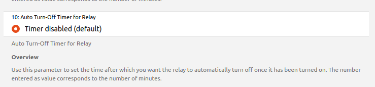 Parameter 10 for this device is “Auto Turn-Off Timer for Relay”.