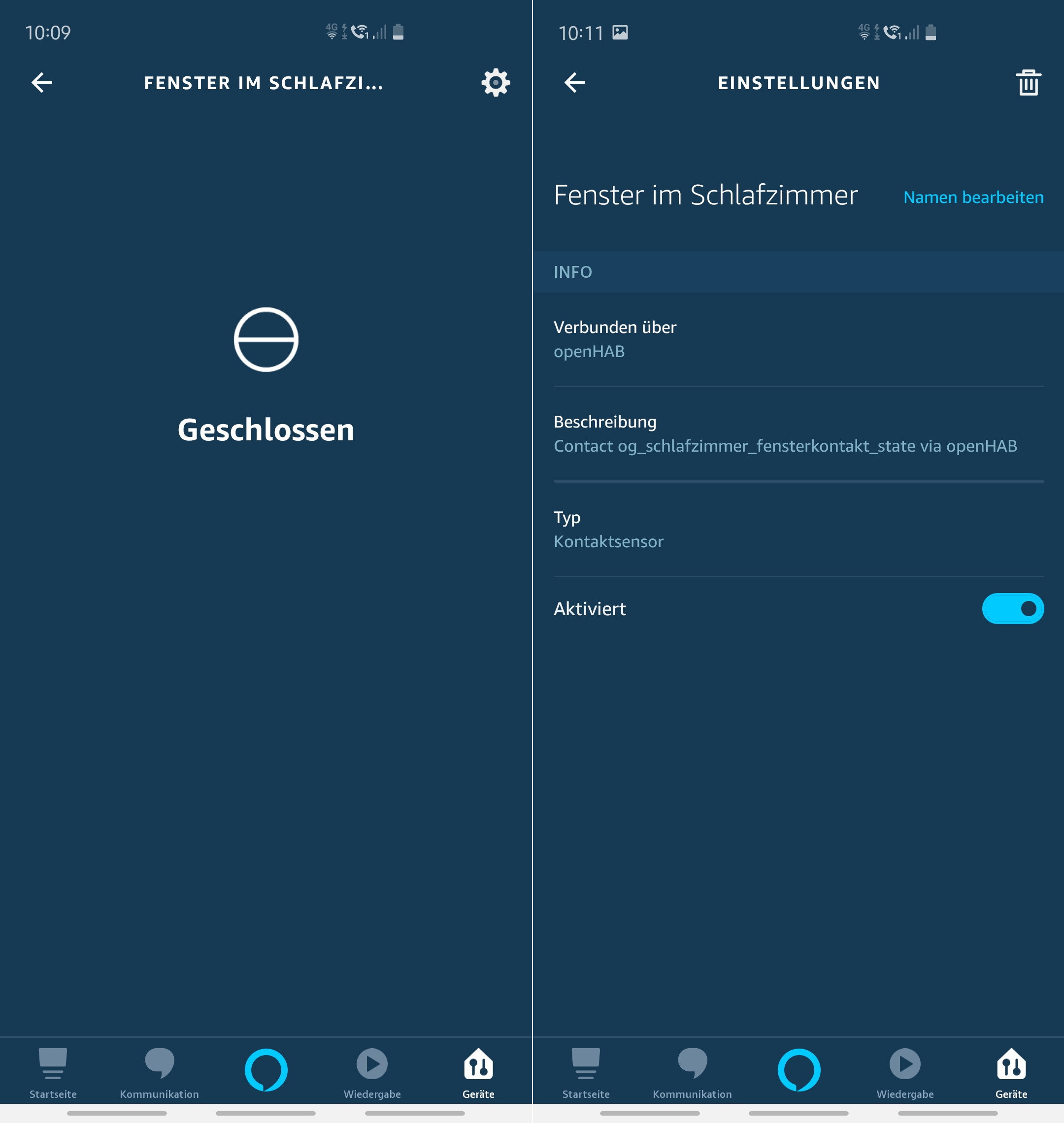 If I ask Alexa for example: “Is my bedroom window closed?”, she’s answering me: “I’ll check this.” and later “Bedroom window is closed”. You can also ask “Is the bedroom window opened?” or “What’s the status of my bedroom window?”.