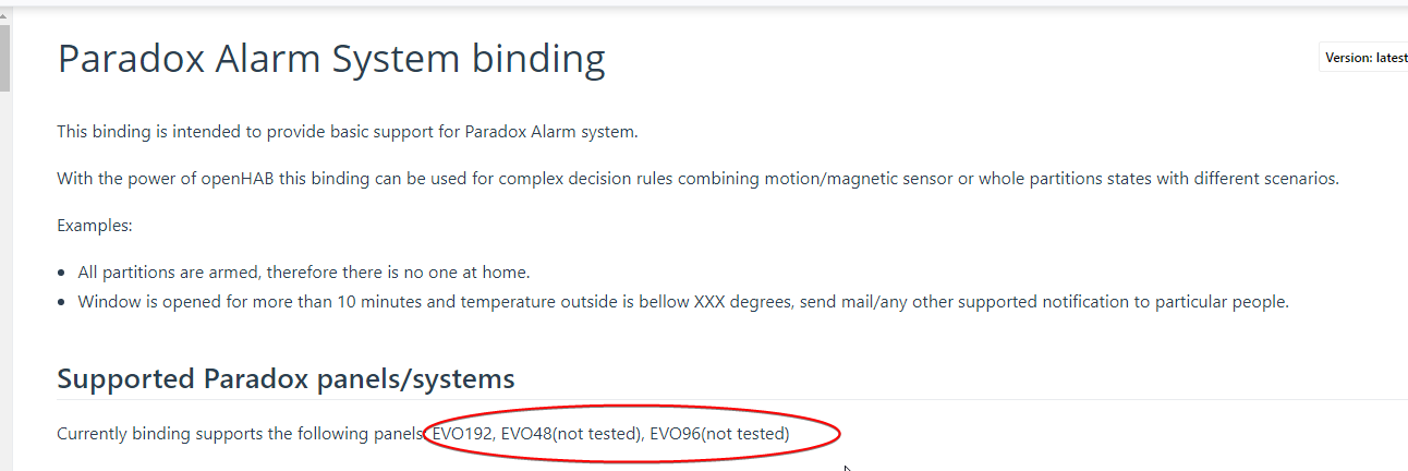 Iāve created a simple binding for Evo systems. Please have a look at this posting where we track the progress of the Evo IP150 binding. The binding is still not in the productive code. It supports only Evo-class security systems since I own one and I could test the coding really well on my own system. The protocol on other Paradox systems seems to differ a lot so Iām not able to provide support for SP-class systems. Current features are only read-only mode reading partitions and zone states.
