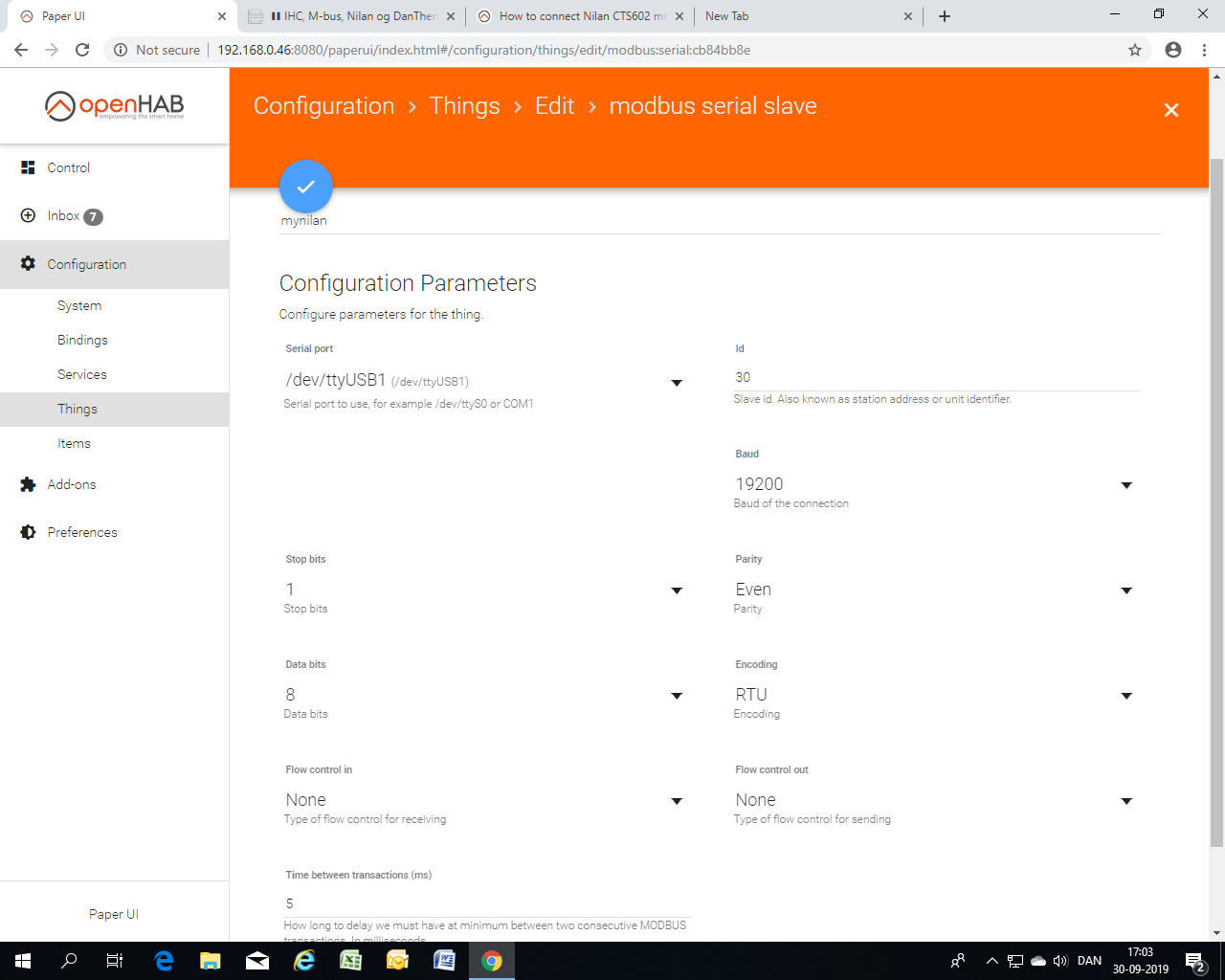 Bridge modbus:serial:myNilan [ port="/dev/ttyUSB0", id=30, baud=19200, stopBits="1.0", parity="even", dataBits=8, encoding="rtu" ] {