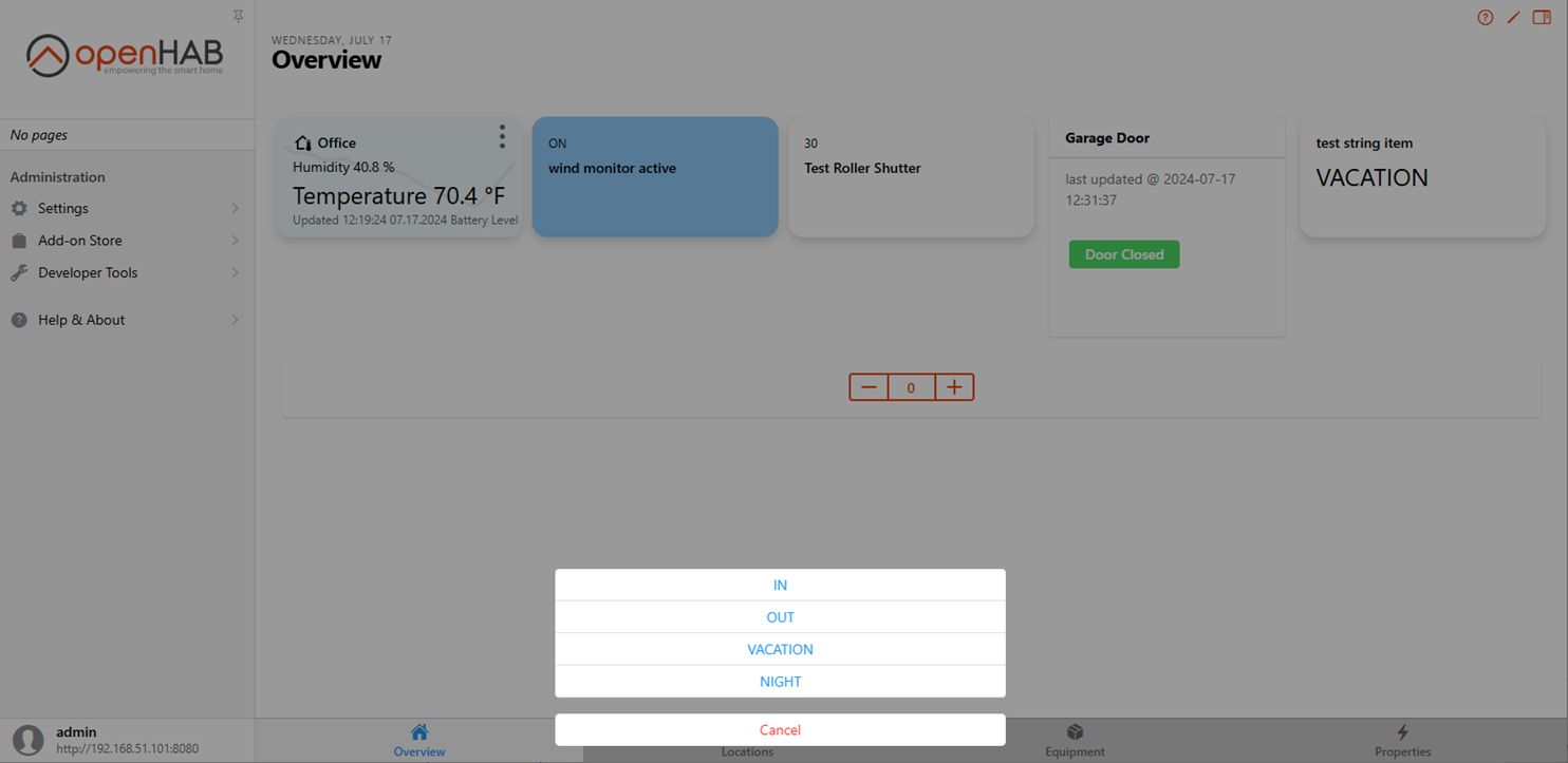 Selection mappings=[night=Night, in=Present, out=absent, vacation=Vacation] label="Select OneMode" item=ItemOneMOde