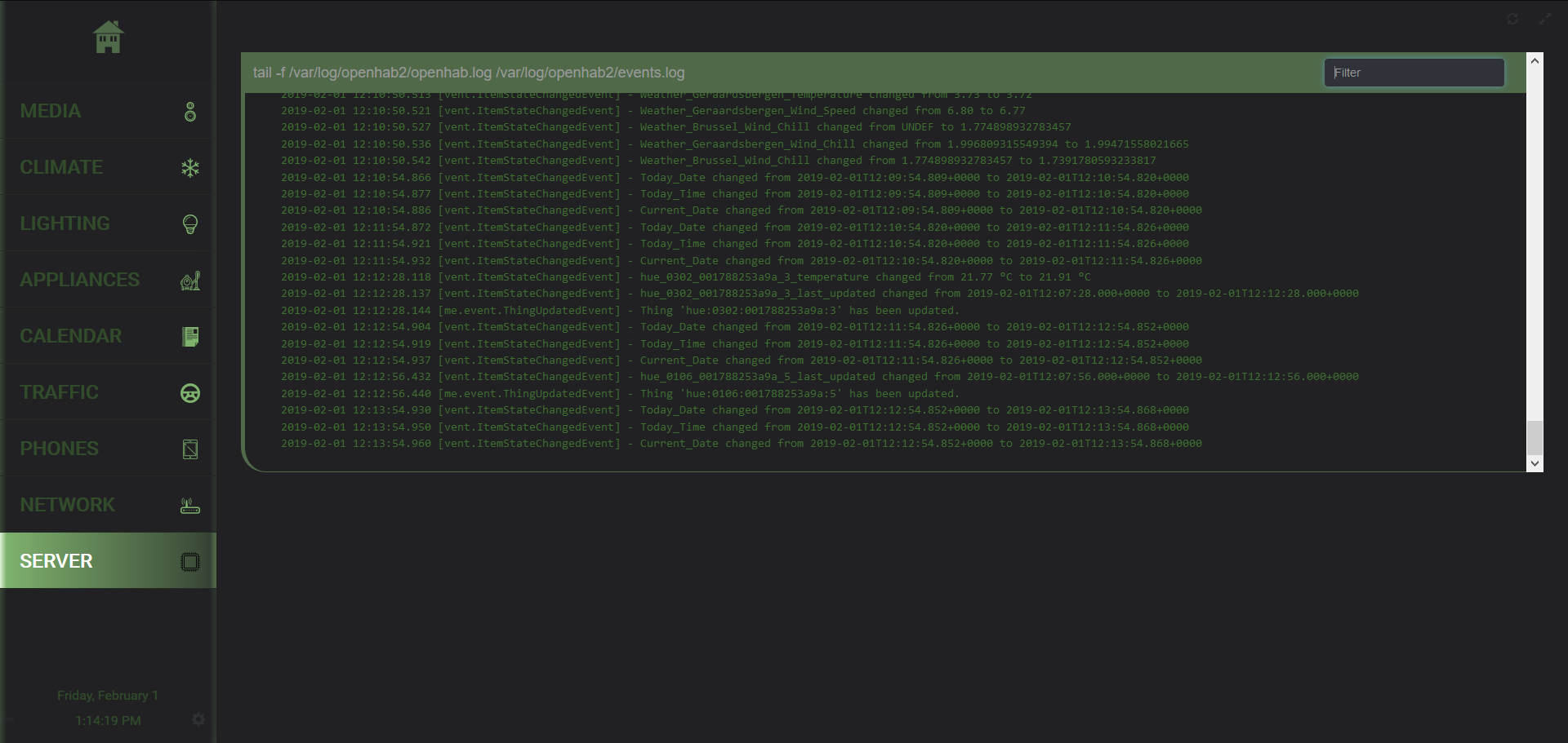 I started out with openhabian, and a very useful tool that came with it is frontail (github).