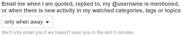 Set “Email me when I am quoted, replied to, my @username is mentioned, or when there is new activity in my watched categories, tags or topics” to only when away.
