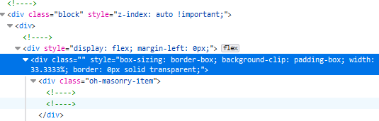 This is why, when you use the css-grid “flavor” of masonry you get the child elements stacked instead of inline, the top-level container doesn’t have display: flex set and you have to do it yourself using the page stylesheet. I’ve never looked comprehensively, so I don’t know what other style differences there are between the top-level containers in these two scenarios which is why I said there might be additional downstream effects of using the css-grid. There also might not.