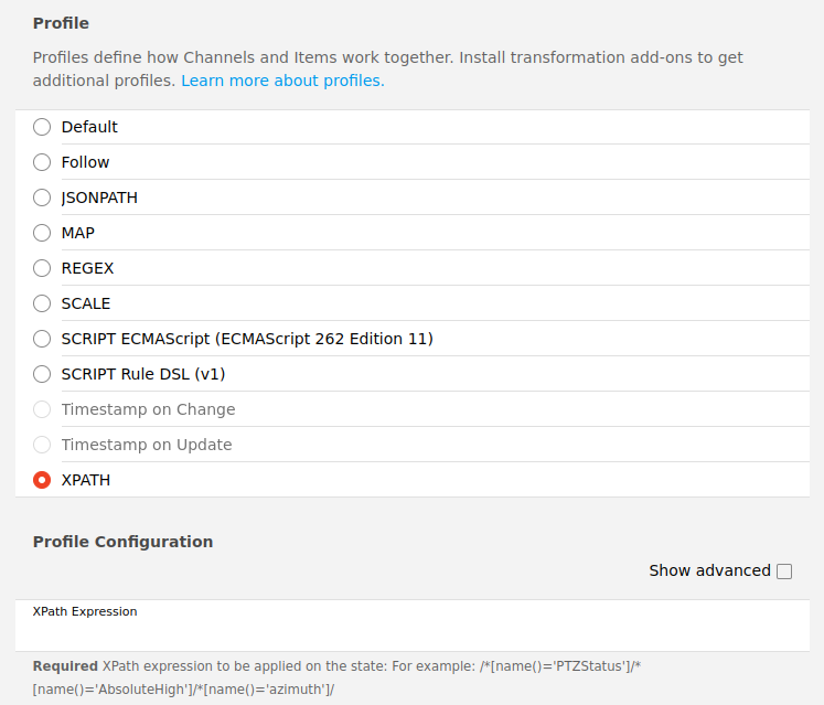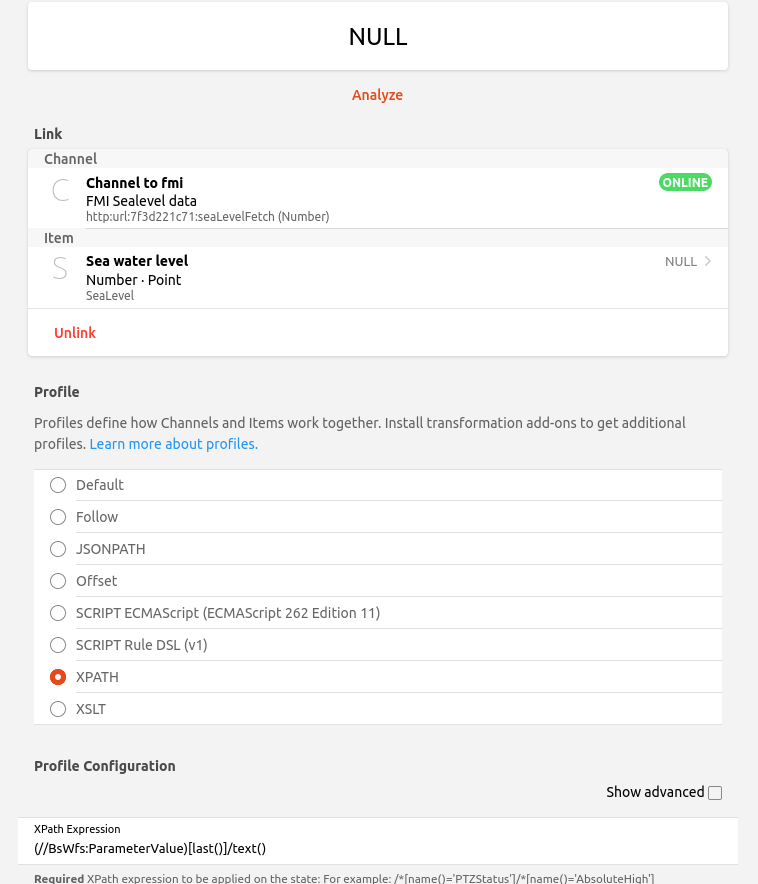 Then you get to define custom channels for that thing (in this case a number type channel) with transformation that convert the data returned by the url call into some viable item state. That’s where the xpath transform comes in. All you’ll need to do is work out the xpath call to extract your information of interest. It should be fairly straightforward in this case. If you need to work it out then just search for an xpath testing site and paste in a sample of the returned xml.