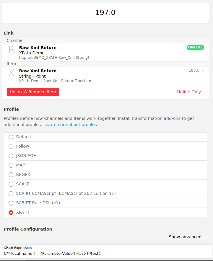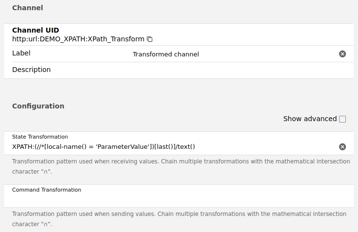 Also note that the XPATH: syntax with the : is unique to the HTTP and MQTT bindings. Other bindings and in the state description pattern/Item labels youād use parens.
