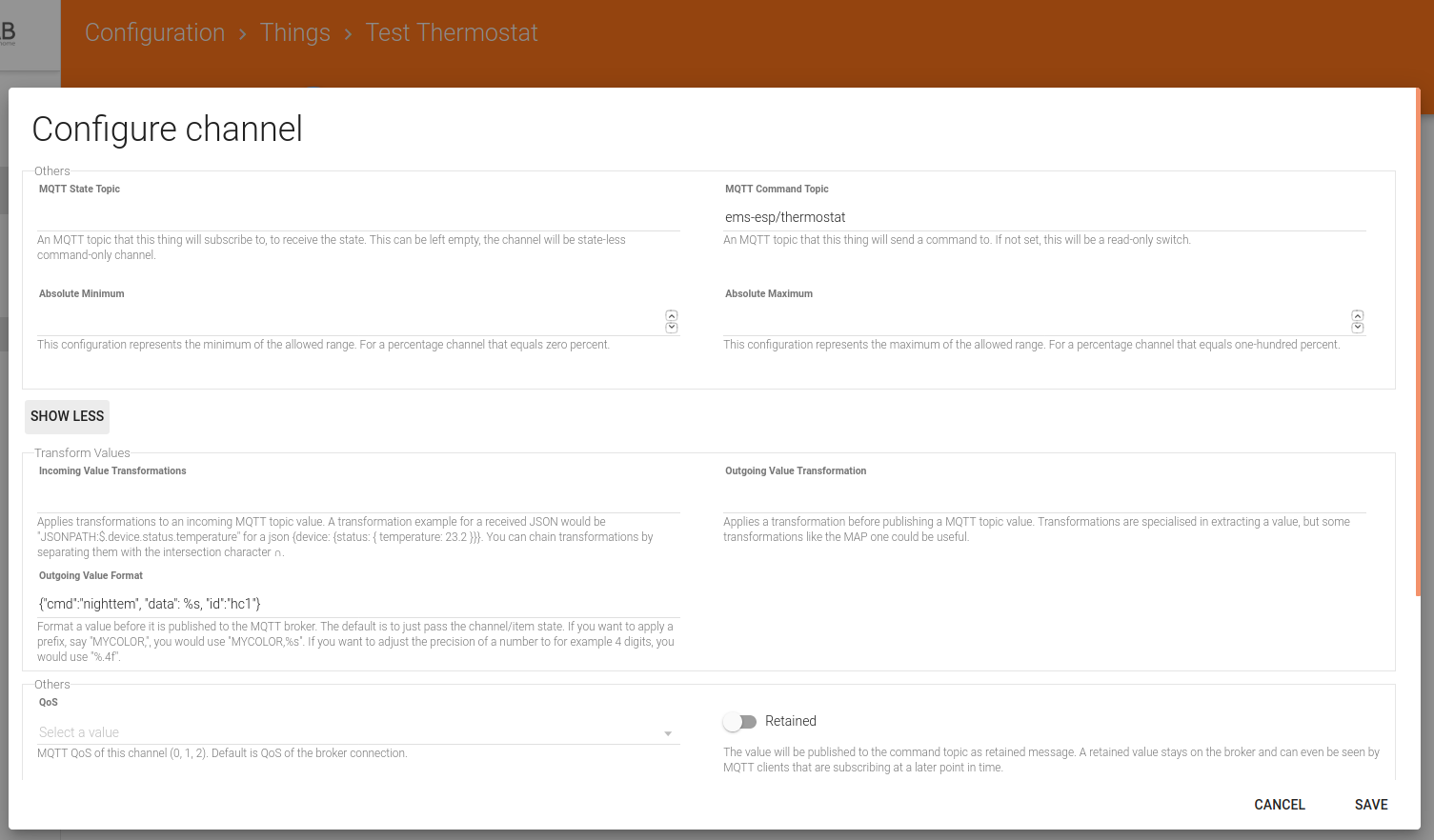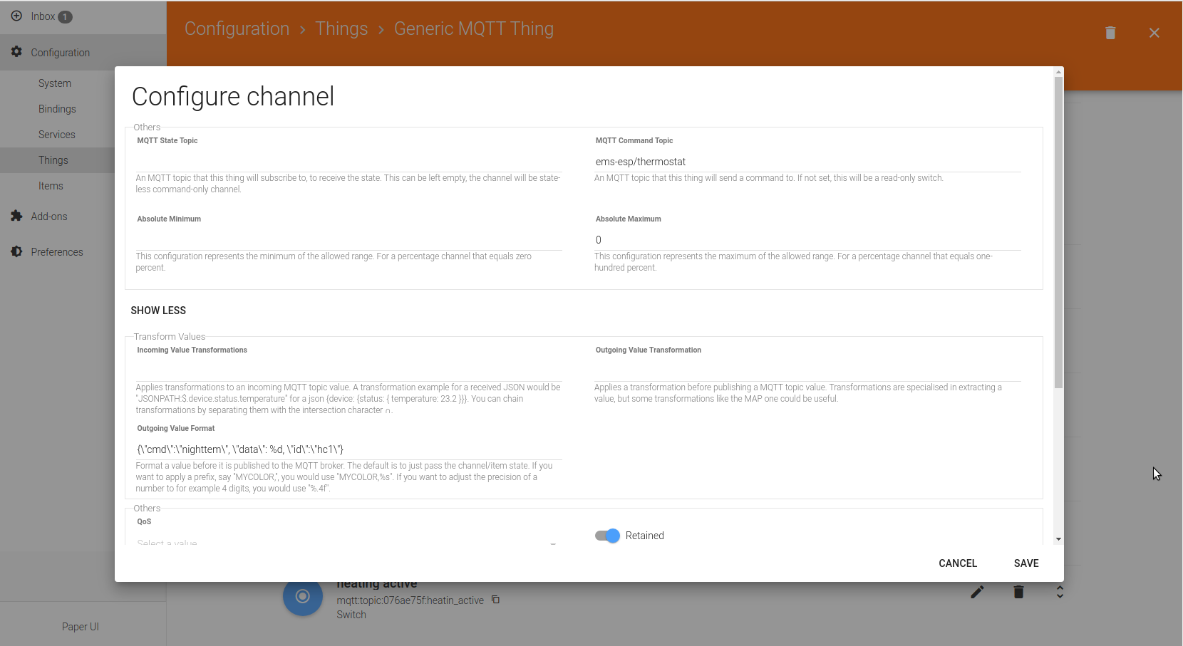 How to send from item out to other device such json fromat data topic ems-esp/thermostat {“cmd”:“nighttem”, “data”: 22, “id”:“hc1”. How the transformation should be in paperui.