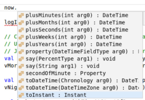 If you use VSCode with the openHAB extension when you type in “now.” a list of all the methods on now will be listed.