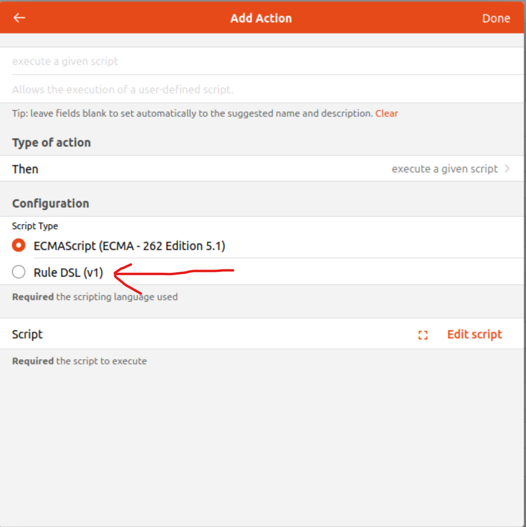 OK, I think the problem here is you chose ECMAScript (aka JavaScript) as the language for the Script Action but the code is Rules DSL. I don’t know if you can change the language after the fact or not. You might need to delete it and recreate it. this time select “Rules DSL (v1)” as the “script type”.
