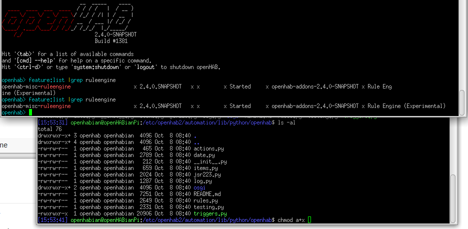 Does the openhab dir and feature list look ok? Wandering why triggering.py has different permissions.