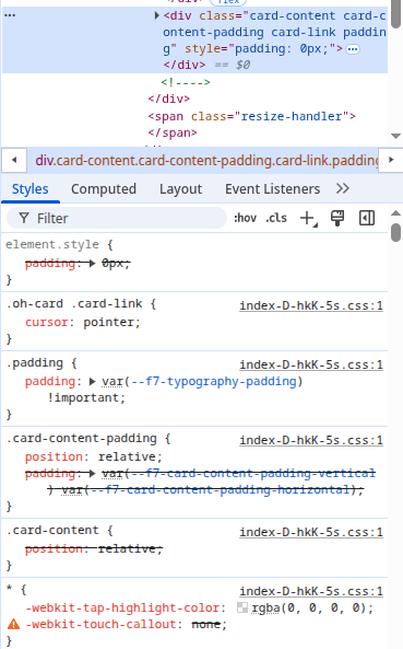This can look a little overwhelming at first, but there’s a lot of helpful information here. For now, I’m just looking at all the hints related to “padding”. First off, the element text itself shows that I did properly declare 0 padding for this element: style="padding: 0px;". However, it also shows that when the oh-card creates the card content container it adds a padding class to the container.