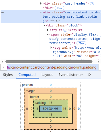 That’s better, but still not right. There is much less extra space around the card icon, but there’s still some extra space above it and as a result it’s not centered in the card content area. To find where that last bit of empty space is coming from, I’m going to use another feature of the browser’s inspector.