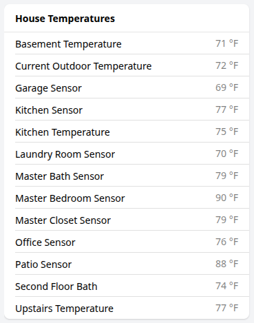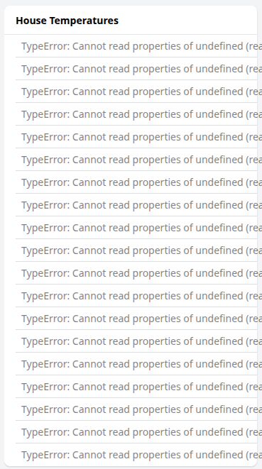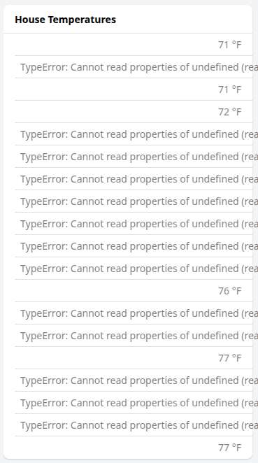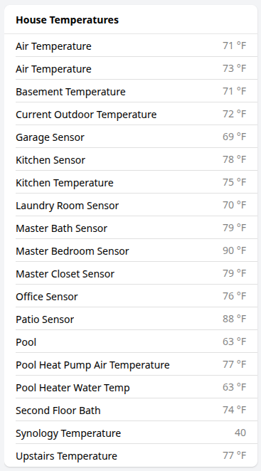 Now that I can see what the items in the list are, it is clear that the repeater is not properly filtering the output list. I can see several “Air” and “Pool” items and the temp of my Synology drive (without it’s °C, for some reason I’ll have to look into later). Claude made the filter expression a pretty standard sequence of boolean tests (in YAML > is just an indicator of a multi-line string, so everything that follows is the same expression):
