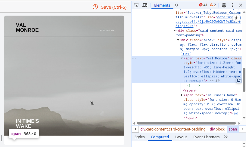 The panel that opens when I inspect that white space shows the html of each element on the page and highlights the element I last interacted with. In this case, however, it thinks the last element I interacted with (where I right clicked) is the base card element, and I have to expand that two levels before I see the span elements I’m looking for. Hovering over the first span element HTML will then highlight that element on the page and show an overlay with the element’s dimensions.