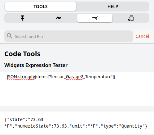 Now, the tester does not have access to the current widget context (even if the widget editor is open) so we can’t use the loop.item variable, but we can just replace that with one of the item names we know it is using. If we put =items["Sensor_Garage2_Temperature"] in the top box, the bottom just says [object object] which is the standard javascript output for an object, and not very helpful here. If we want that in more readable terms we have to “stringify” it: