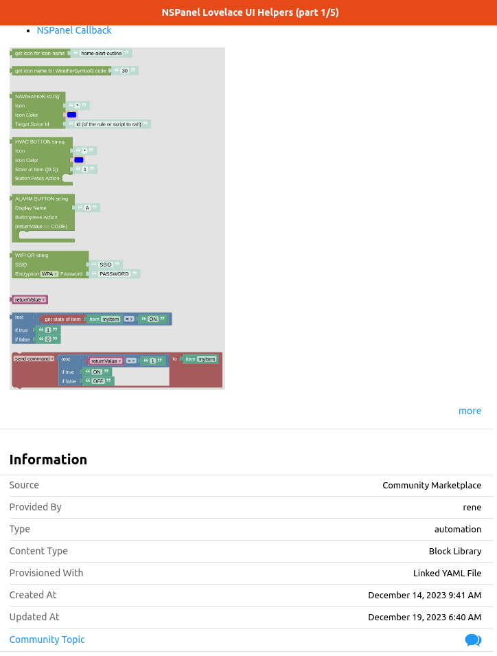 Hi, just wrote some Block Library to use the NSPanel Lovelace UI with openhab. How to share this library? I have found some information about how to write some Block Library, but none about howto share these. Please point me to the right documentation source or give me some hints…