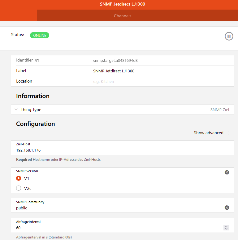 Settings → Things → press blue [+] button → SNMP Binding → SNMP Target → configure hostname → Create Thing → Select the new Thing from the list of all Things → Channels → Add channel (OIDs correspond to Channels of the Thing) - don’t forget to save your changes.