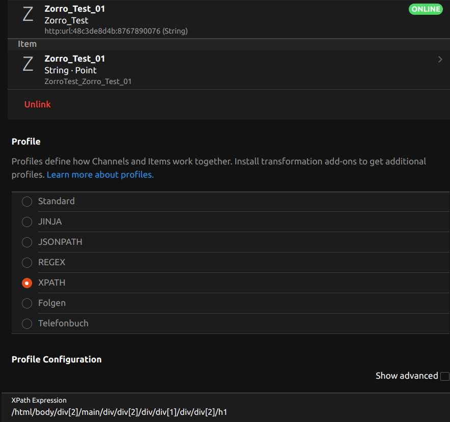 Hello i installed the http binding and the xpath transformation. I want to extract the content " [PRE-ORDER] RadioMaster Zorro" from the website https://www.radiomasterrc.eu/shop/transmitters/zorro/radiomaster-zorro/. I installed a thing with the http binding, created a channel and an item. Using a Chrome-Addon “xpath” i could extract the correct xpath expression “/html/body/div[2]/main/div/div[2]/div/div[1]/div/div[2]/h1”. I checked it with the xpath-helper Plugin from Chrome and it is correct. When i put this into the item, i get the full page, but not the content i want. It seems this problem is similar to this thread. https://community.openhab.org/t/oh3-http-binding-xpath-no-values/124018/13 There where problems with the namespaces. Unfortunately i am not able to get my xpath expression work. Could anybody help me please? Thank you very much