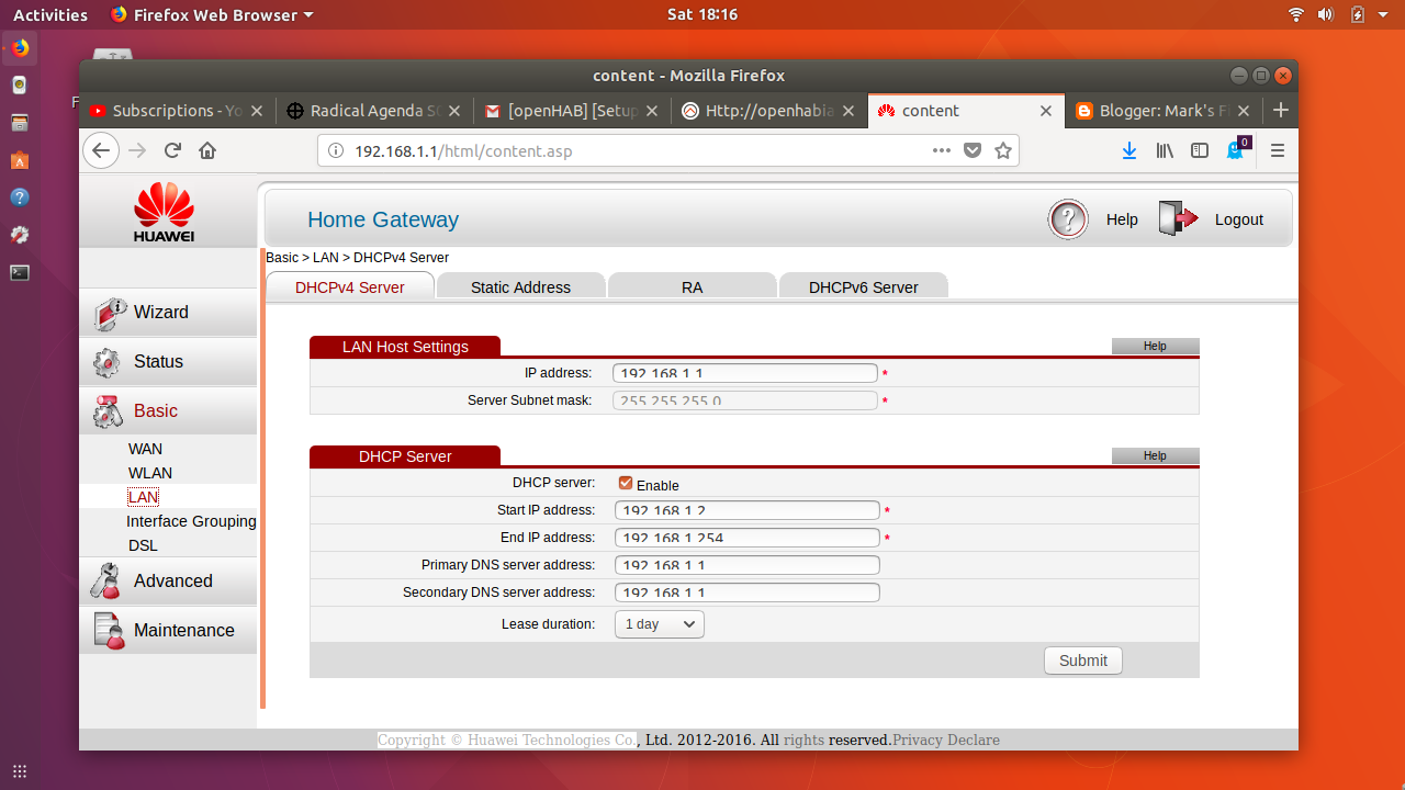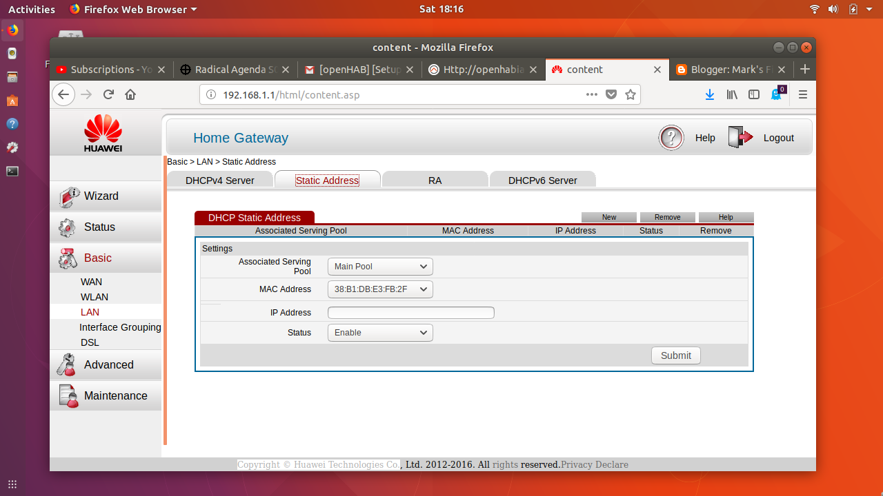 The Router was the one out of the cereal packet with iiNet. Huawei, I must confess I dont see any obvious options for setting up static IPs and assigning them to my http://openhabianpi:8080 host.