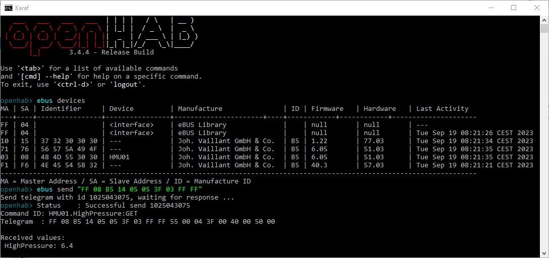 The answer telegram is “FF 08 B5 14 05 05 3F 03 FF FF 55 00 04 3F 00 40 00 50 00”. This telegram leads resolved to 6.4 bar pressure. This will of course not happen before you have setup the apropriate custom config file.