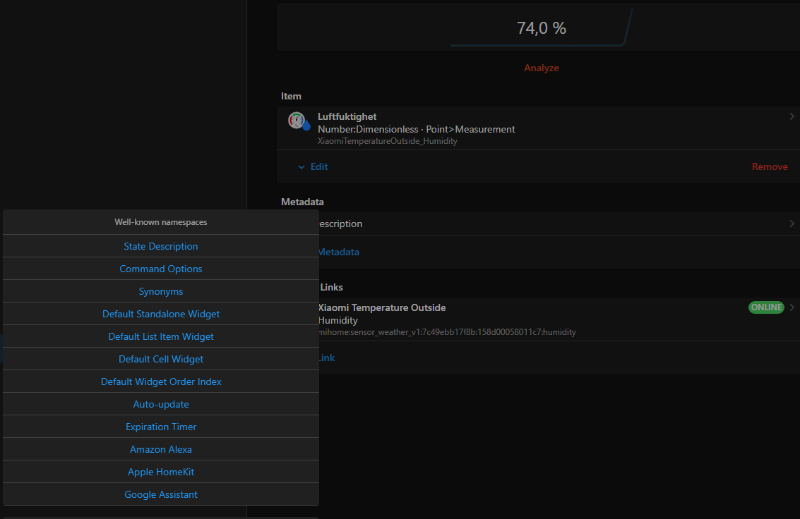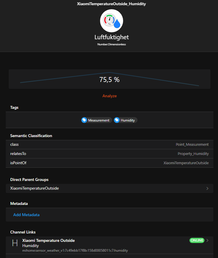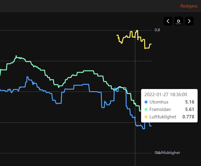 I created a chart with the outside temperature and humidity. Unfortunately the humidity displays a value between 0 and 1, instead of diplaying the humidity in percentage ( “Luftfuktighet” in pic1).