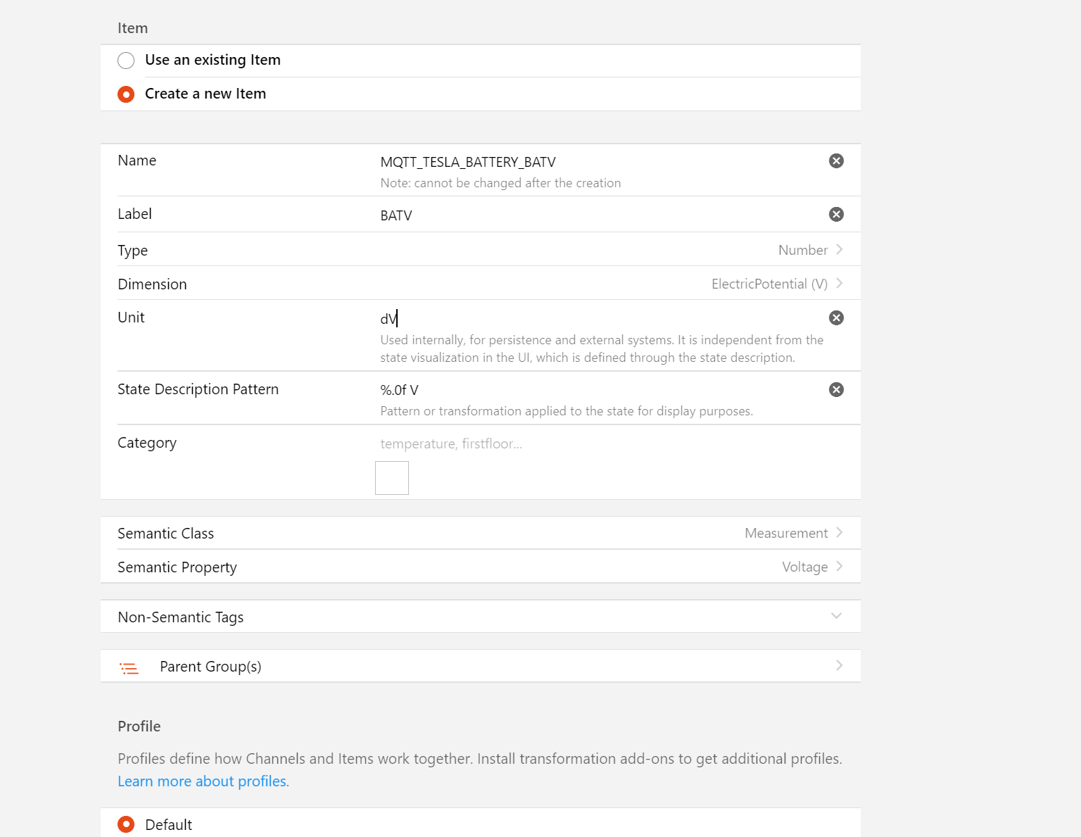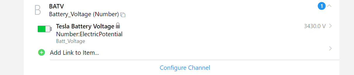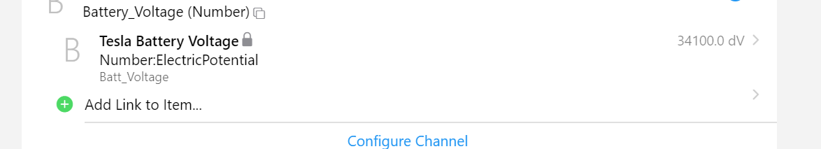 Number:ElectricPotential TeslaBattery "Tesla Battery" <battery> {channel="mqtt:topic:broker:tesla:vBat", unit="V", stateDescription=""[pattern="%.1f V"]}