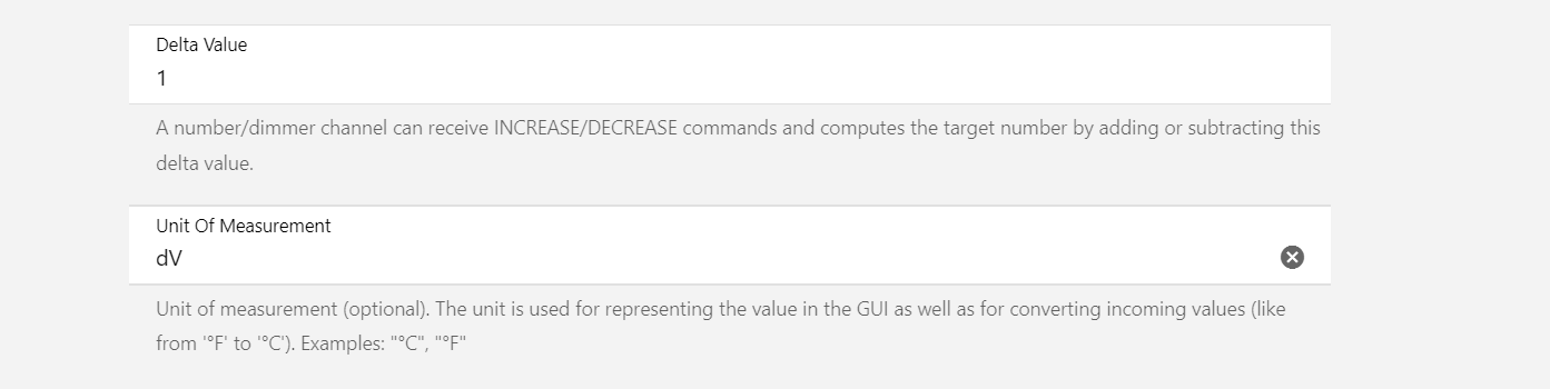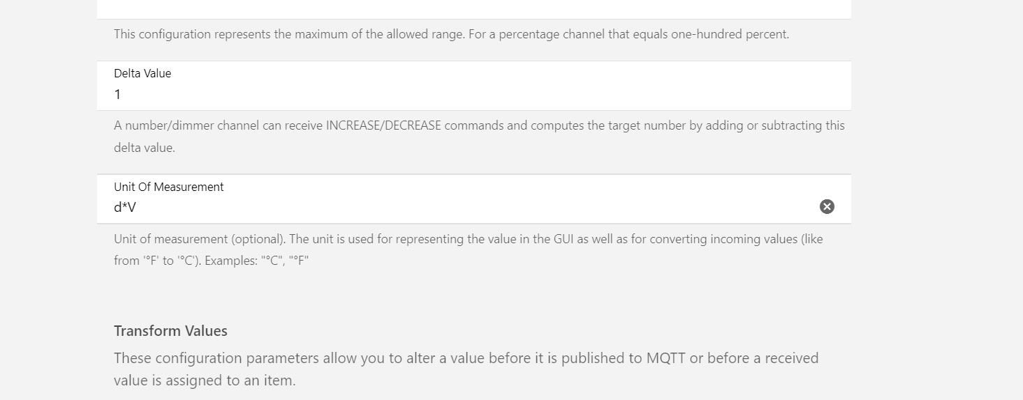 channel "test", "number", config: { stateTopic: "test/test", unit: "dV" }