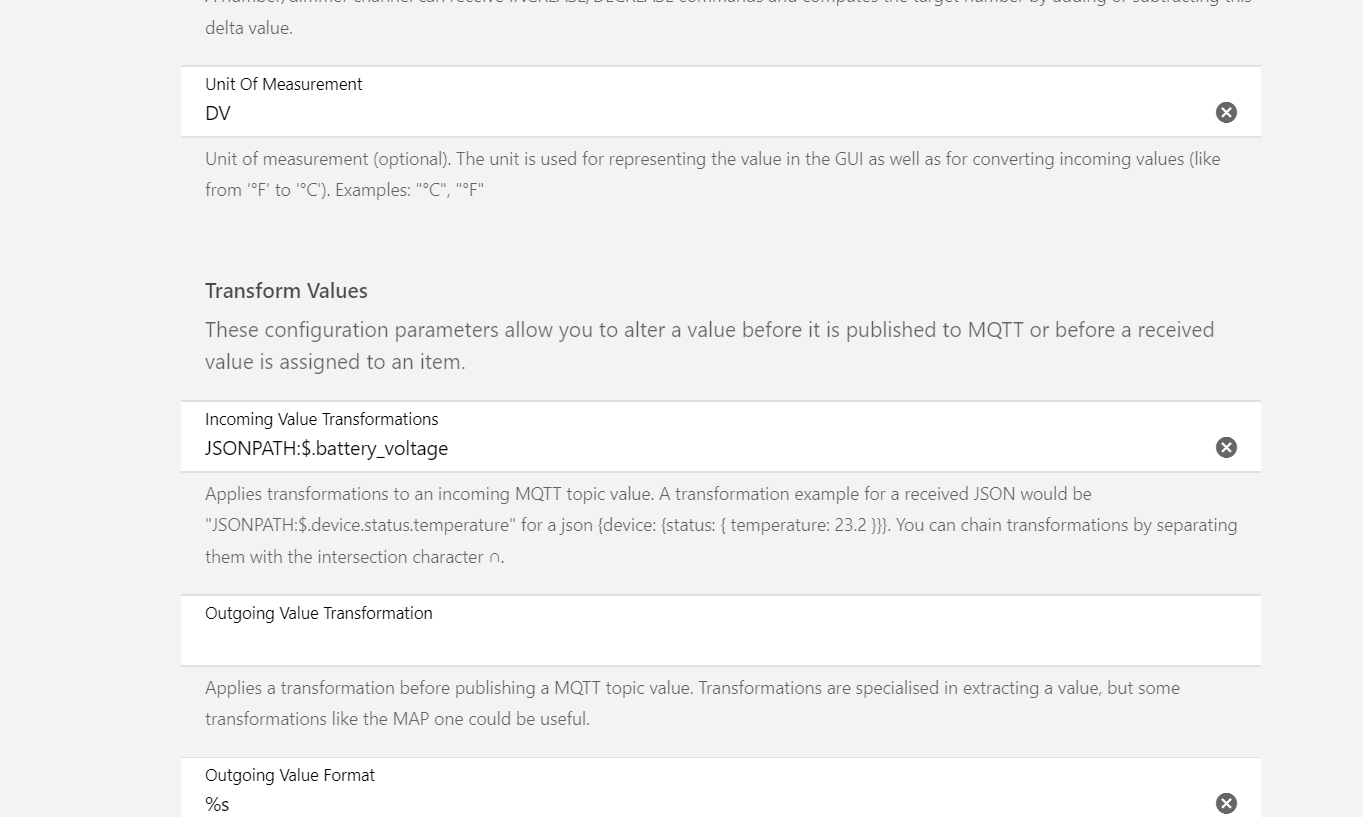 Type number : vBat "battery voltage" [ stateTopic="battery/info", transformationPattern="JSONPATH:$.battery_voltage", unit="DV" ]
