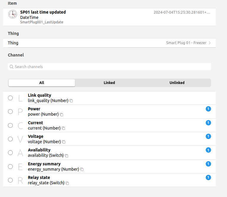 This screenshot also shows a date item linked to a number channel, which is what I cannot do anymore on newly created (MQTT Generic Thing) channels.