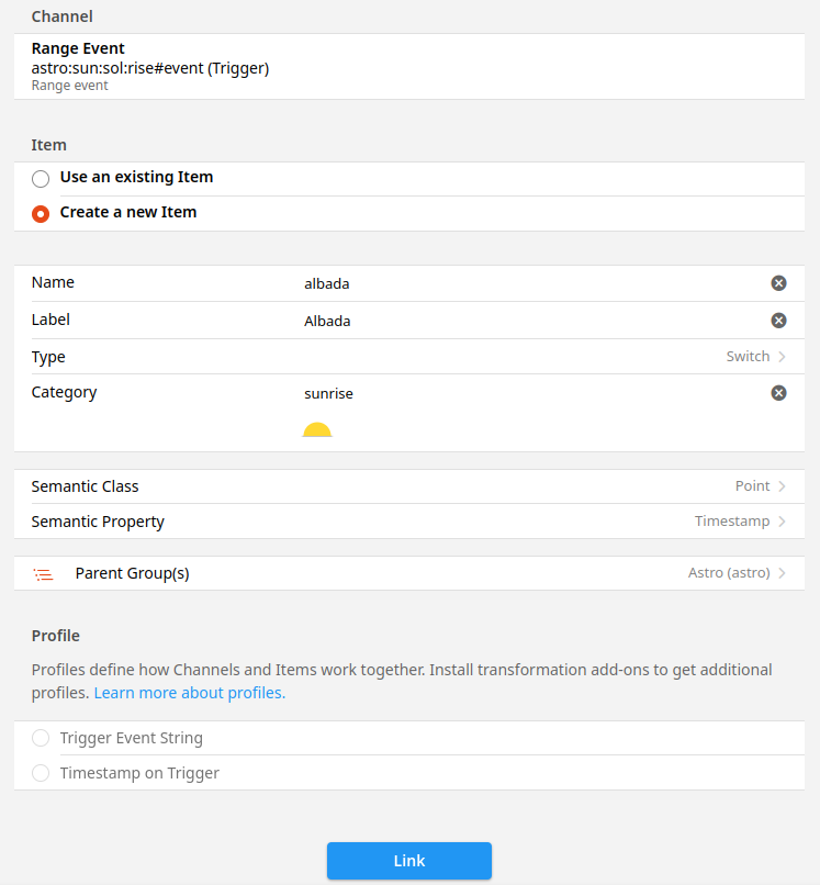 I have just upgraded from OH2.5 to an all GUI OH3.2.4, which is running fine except for the Sunrise and Sunset Triggers. Searching for help led to this post from Sep 2022 showing Trigger: