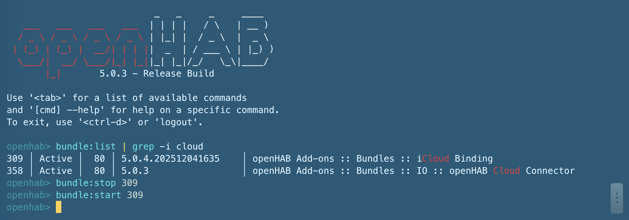 358 │ Active │ 80 │ 5.0.3 │ openHAB Add-ons :: Bundles :: IO :: openHAB Cloud Connector