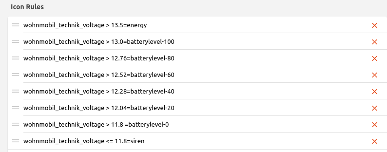 Text item=wohnmobil_technik_voltage label="Bordspannung" icon=[wohnmobil_technik_voltage >"13.5"="energy", wohnmobil_technik_voltage >"13.0"="batterylevel-100", wohnmobil_technik_voltage >"12.76"="batterylevel-80", wohnmobil_technik_voltage >"12.52"="batterylevel-60", wohnmobil_technik_voltage >"12.28"="batterylevel-40", wohnmobil_technik_voltage >"12.04"="batterylevel-20", wohnmobil_technik_voltage >"11.8"="batterylevel-0", wohnmobil_technik_voltage <="11.8"="siren"] {