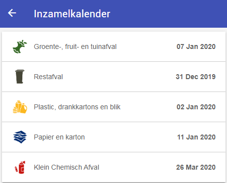 So I took up the challenge and re-wrote the thing in Python + Openhab-Python interface. The end-result is shown below. An overview of all garbage collecting moments, daily updated and a telegram message the evening before and early in the morning.