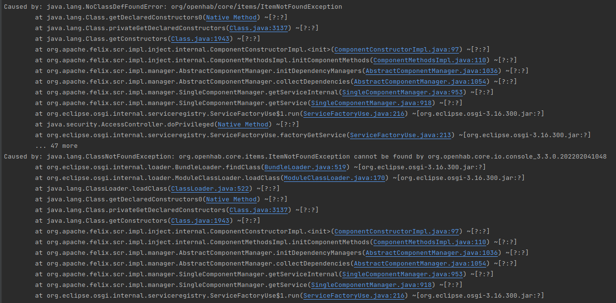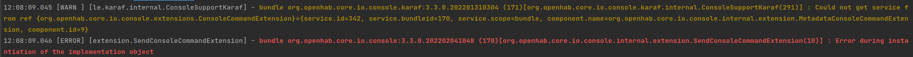 My problem is that when I run my modification with the OpenHAB distro project I get the following errors in the OpenHAB log:tail command: