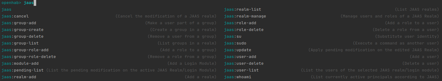 I saw in the openhab console that there are the following commands with jaas (Java Authentication and Authorization Service):