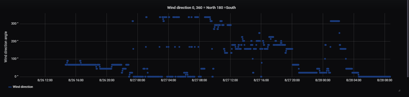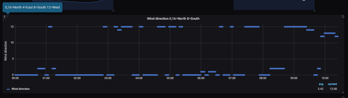 ps Just noticed an issue with the average wind direction. North directions are around 15, 0, 1 in number terms. So, when the wind is northerly and flipping between 0 and 15 results in average of 8 ie south grrr. Should work for other wind directions but North is a problem. Any ideas how to fix that would be appreciated. …Looks like I have to some maths and convert the wind angle to x and y components. Then average these x and y values and convert back to angle. I could use JavaScript to compute the x and Y using SIN and COS. Persist these values into influx and get influx to transform the average back to angle using ATAN I don’t see ATAN appearing in Grafana metrics options but there is talk of it for Influx … hmmmm.