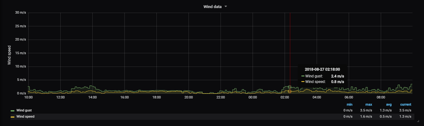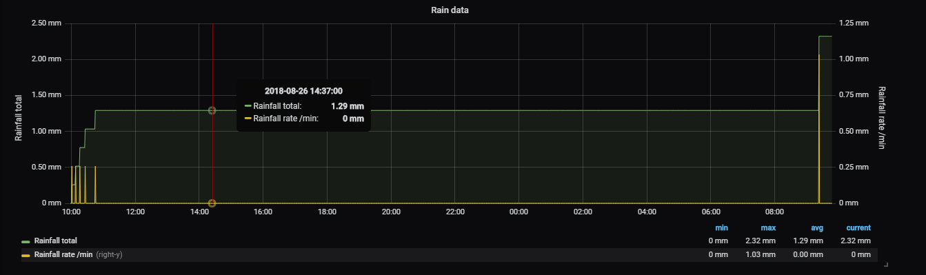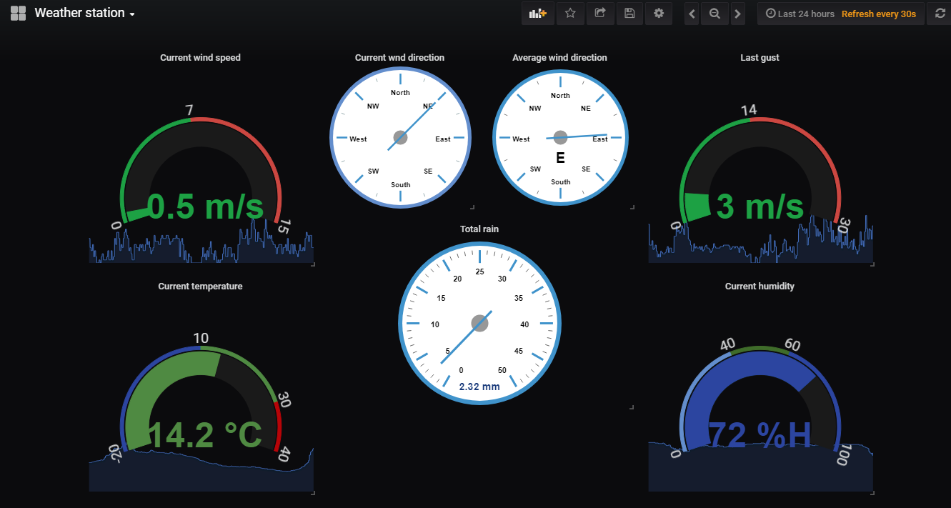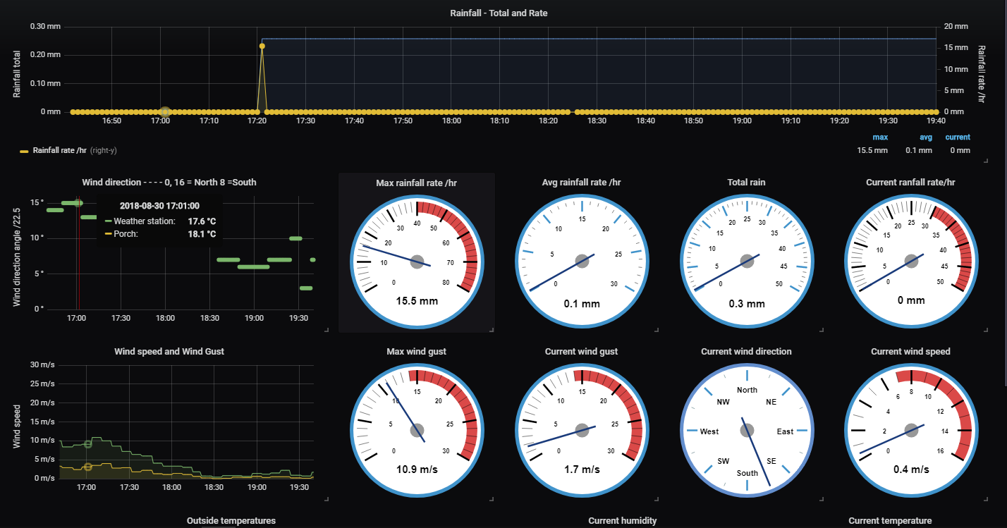 In Grafana I used the D3 Gauge panel plugin and implemented Value and Tick mapping for the wind direction gauges. The rain total gauge is, like the charts, also dynamic and adjusts its value depending on the time period selected. To achieve this I used SELECT mean, difference and cumulative sum in the metrics as the mobile-alerts data is just a running total of rain fall since the sensor was activated.
