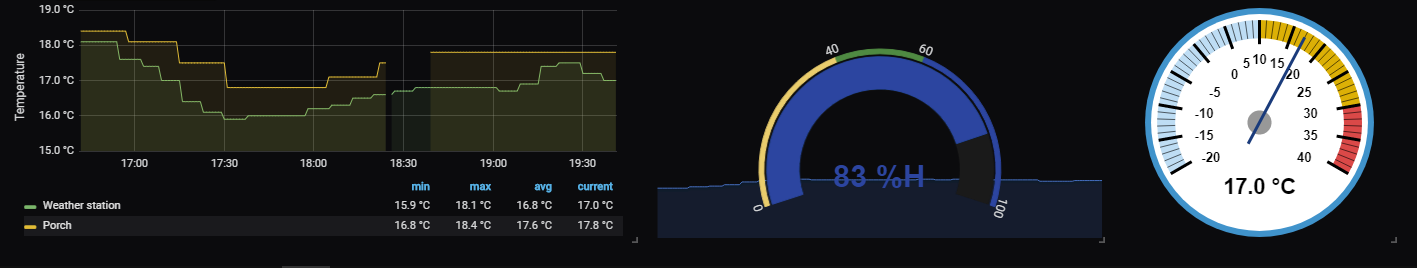 The screen shot below is taken from Grafana but the dials also shows dynamically in Habpanel. I also have the usual plots and charts for all my room thermostats (Openwebnet binding) but here I show some nice Grafana gauges displaying the dynamic data from my Mobile-Alerts wireless rain ,wind, temperature and humidity sensors. These sensors enable a relatively inexpensive wireless weather station to be built or monitor things like garage, fridges, fish tank, pools and ponds etc. They can be found under various brand names. Discussion: mobile-alerts-and-openhab
