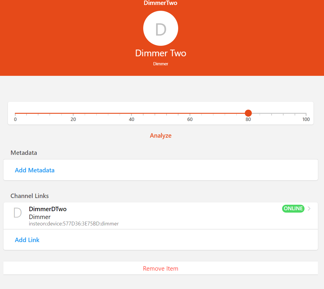 The first and third dimmers in Items are new dimmers. The second and fourth are dimmers previously attached to the Hub when Insteon was alive. I have previously factory reset all devices. Whenever click on an Item and try to dim to a certain level on fully on (or fully off if I manually turned device on), the previously installed dimmers work beautifully. The newer ones never respond.