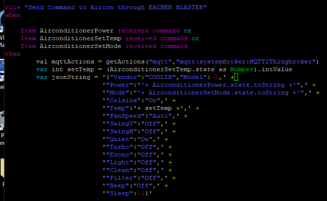 So when the string is changed check to make sure it is Protocal COOLIX if so then get all the data out of the string and put them in variables. Make sure Power is the correct format. Update all the Items to the correct state.