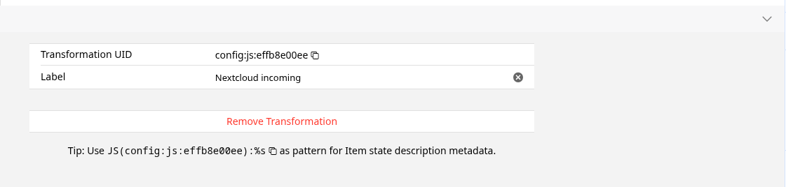 When you open up the transform page and see the code of the transform, in the bottom right of the page there is a small blue chevron. Click on that and you will bring up the bottom panel with the transform label and UID (that’s also where the link to remove the transform is).