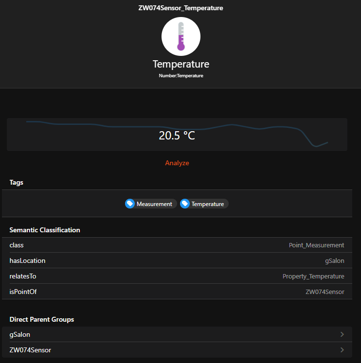 So I have added my temperature measurement to both the Equipment and the living room Location. You can see in Model treeview that when you select it it is recognized to be one single item (it appears twice but is also highlighted twice).