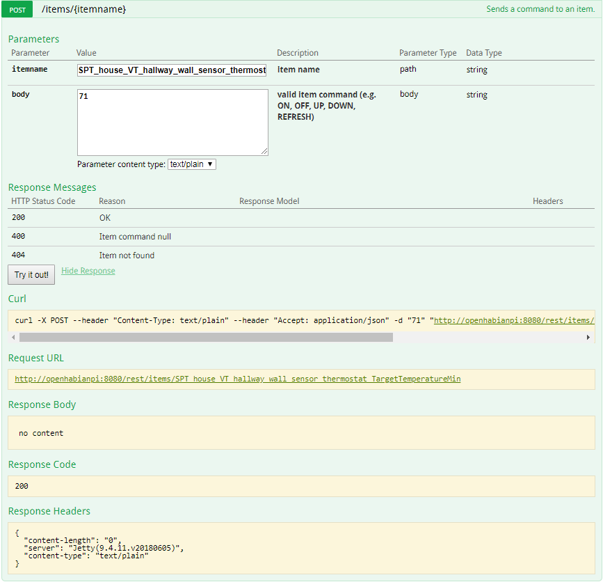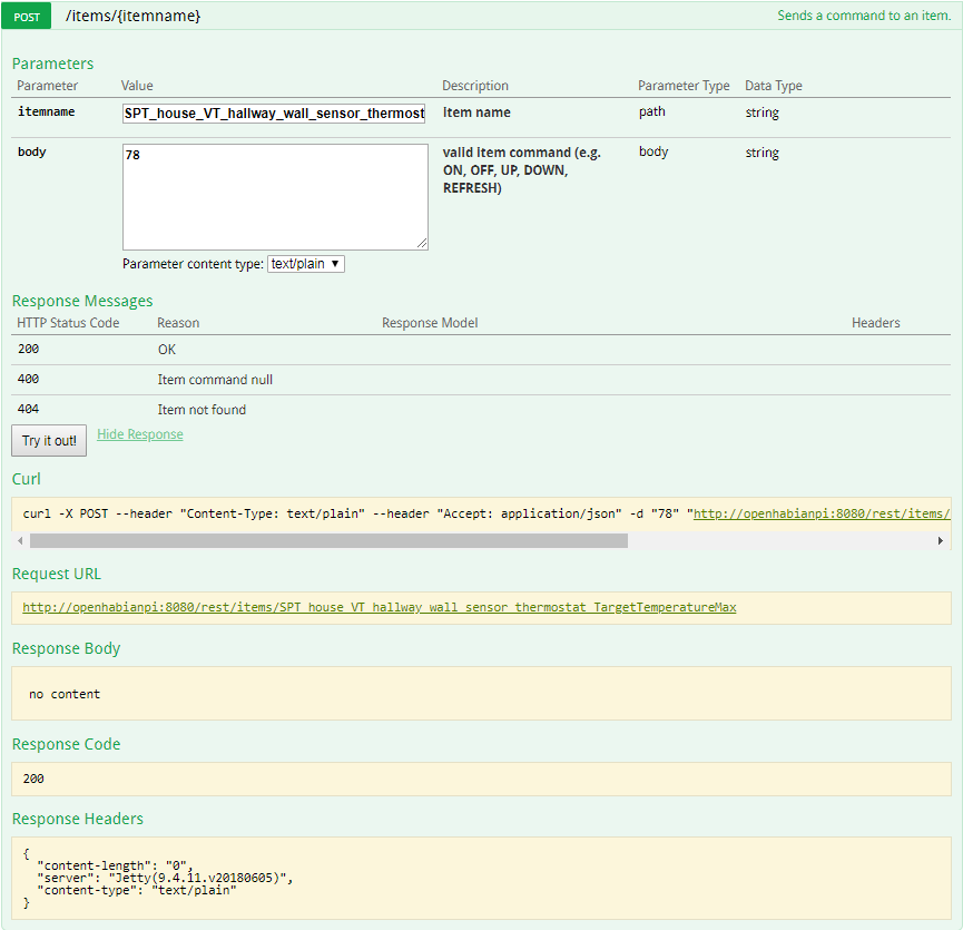 The images below show that the “Max” (name appears truncated due to length of Item name vs. the length of the text box) POST completed successfully (200), yet when I look at the Item state it does not match the value I just set. In fact, it is the value at which the Item has been stuck at since this problem started.