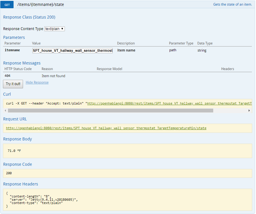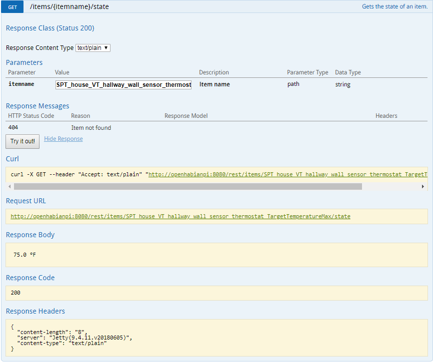 Today I decided to use the REST UI to work my way upward toward the CalDav binding. I used the Item POST to send a value to the Item followed by an Item GET to look at the state.