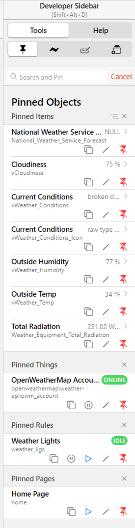 Use search or the Item selection dialog in the developer sidebar and pin the Items that you are working on at any given time. Notice that you can navigate between Items and if the Items are actuators, you can send commands to these Items from the sidebar. Also, you can pin Things, Rules, and any other OH entity to the sidebar at the same time, navigate to them and disable/enable and run all from the sidebar.