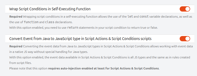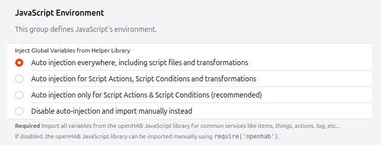 This determines how the openhab-js helper library is made available in your rule. It controls when the helper library is just there and available or when you need to explicitely import it using a require('openhab');