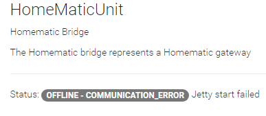 20:40:39.564 [INFO ] [ome.event.ThingStatusInfoChangedEvent] - 'homematic:bridge:KEQ0384864' changed from INITIALIZING to OFFLINE (COMMUNICATION_ERROR): Jetty start failed