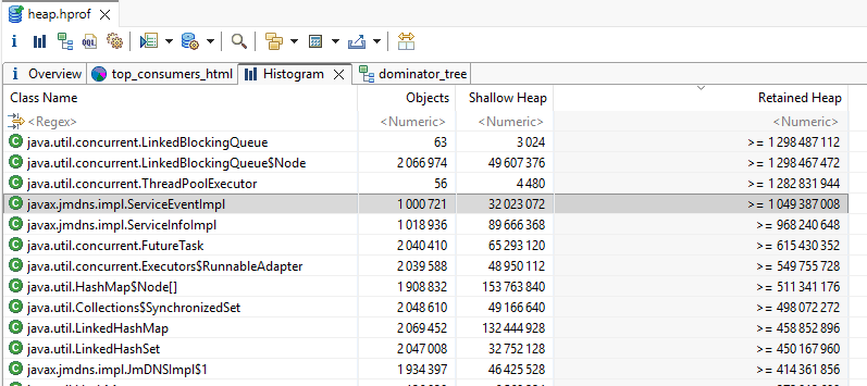 What i find is many reference java.jmdns.impl.ServiceEventImpl (see the capture below).